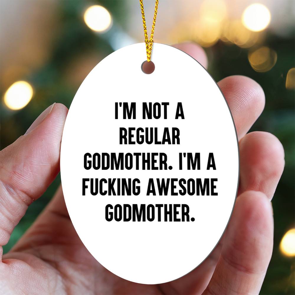 Awesome Godmother Gifts - I'm Not A Regular Godmother Funny Christmas Ornament for Home Decor - Unique Oval Ceramic Ornament with Gold Tone String, White Glossy Finish, Funny Gifts for Godmothers