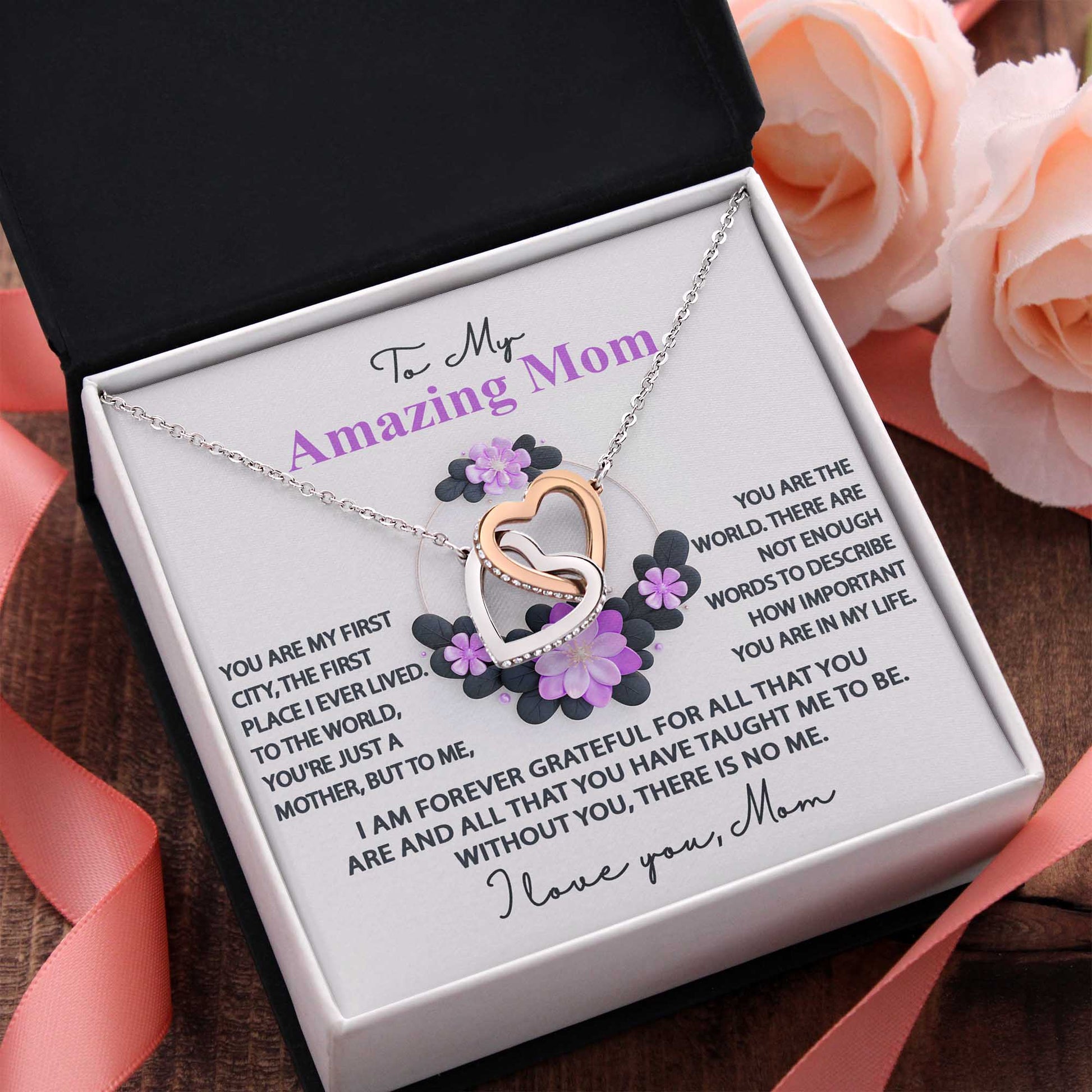 To My Amazing Mom, Forever Grateful, Interlocking Hearts Necklace